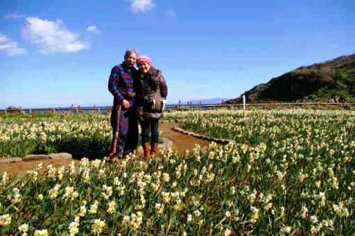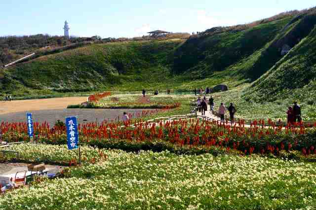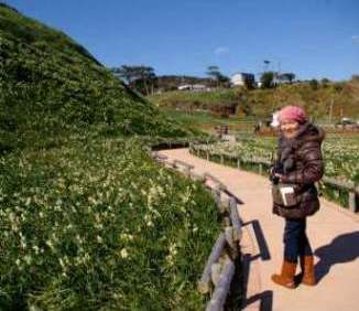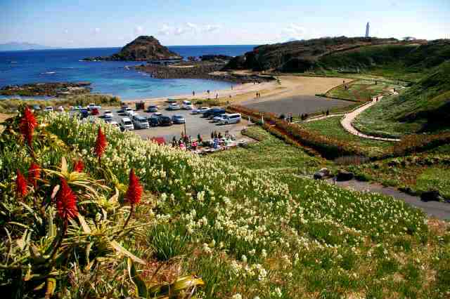 ![]() 爪木崎は暖かく、アロエ、水仙が満開でした。水平線に大島がぼんやり見えます。 |