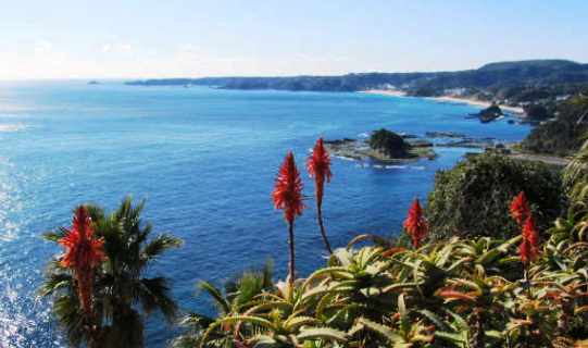 ![]() 道を間違え着いた展望台の「尾ケ崎ウイング」Pより爪木崎を アロエの花にメジロが |