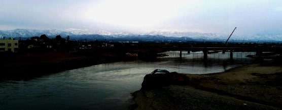 ![]() 白山なのか北アルプスなのか、夕闇に雪を光らせ薄らと浮かんでいた。 |