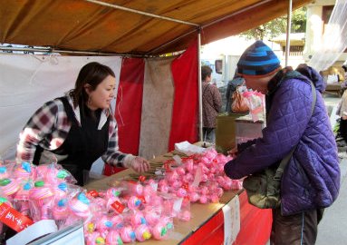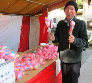 ![]() お祭りは楽しいな〜! かっちん玉とは、竹の先に白・赤・青・黄の飴を丸く練り固めたもの。 |