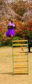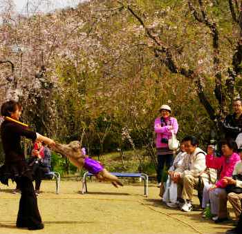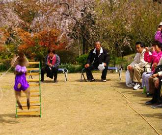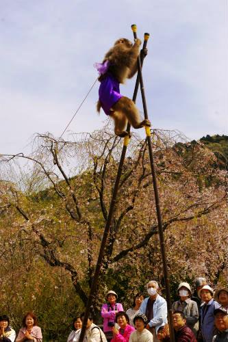 ![]() 竹馬に乗るまでの準備を、猿が自分で担いで乗るには感心した。 降りるのは調教師に倒れこんで受け止めてもらっていました。 |