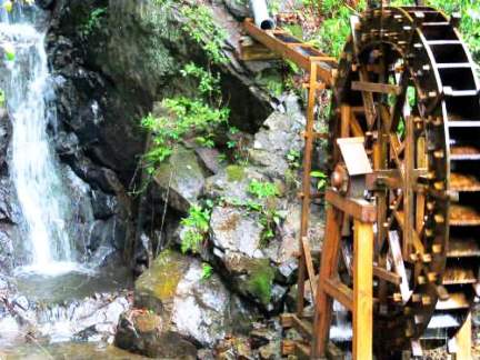 ![]() クギを1本も使用せずに会員の人が手作りにしたオール木製の水車がありました |