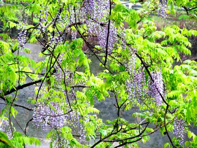 ![]() 満開の『ヤマフジ』を楽しんで帰路に着く 山藤のツルは左巻、庭園に植えられる藤とノダフジは右巻きです。 |