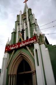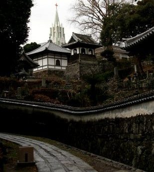 ![]() 平戸ザビエル記念教会と光明寺、瑞雲寺が交差して見える。 |