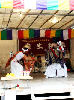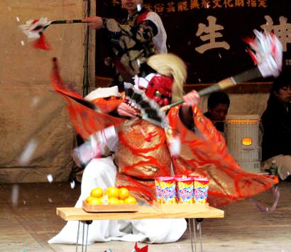 ![]() 雪が舞う中、笛、太鼓のお囃子に舞う二人(鬼を退治する神官の舞?) |