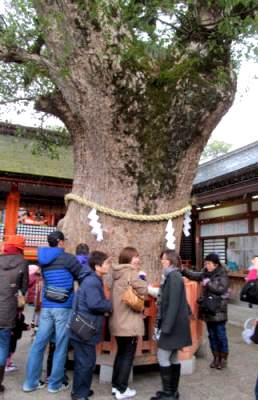 ![]() 御神木に触れて後利益を皆が授かる。神木もやせる思いだ。 |