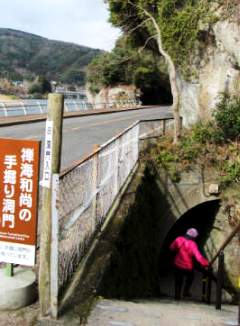 ![]() 今は車が通るトンネルになっているが、昔の素掘りのトンネルも一部残っている。 禅海達が彫った当時のノミとツチの後が残る |