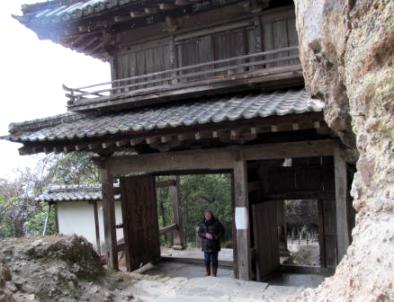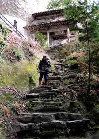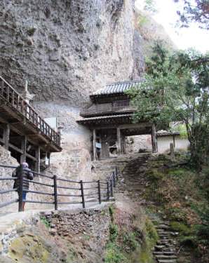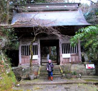 ![]() 千体地蔵を拝み、羅漢山の中腹の岩肌にしがみつくように立つ山門をくぐる。 |