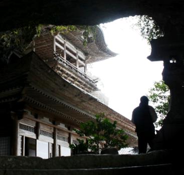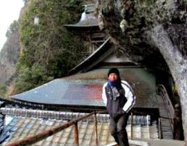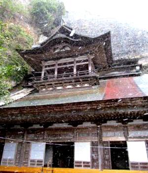 ![]() 歴史は約1300年前の大化元年(645年)にインドから来た法道仙人が開いた古刹: 洞窟を抜けたら羅漢寺の本堂が現れ、突然雪が強くなってきた。 |