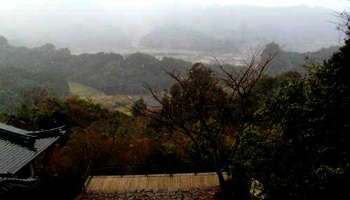 ![]() 本堂2階へ上がるも耶馬溪が霞み、山麓右端に古羅漢が見える。 |