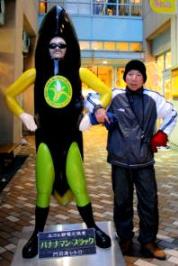 ![]() バナナのたたき売り発祥の地、バナナマンと記念写真。 |