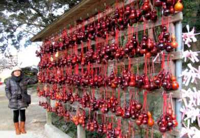 ![]() お参りは正面からは、外れているが横から柏手を打ってきました。 天神さまが、梅の木の下で「ひょうたん酒」を飲み、難を免れた伝承がある。 厄が晴れた時の厄晴れひょうたんが御本殿裏に掛けてある。 |