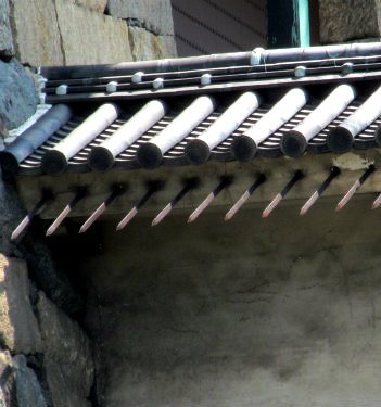 ![]() 『剣塀』 大天守と小天守を連結する櫓台は、高い土塀で囲われ、 塀の軒に鋭い槍の穂先がぎっしりと並べられている。大天守へ敵の侵入を防いでいる。 |