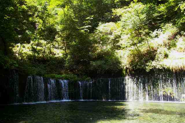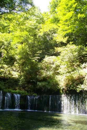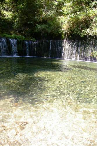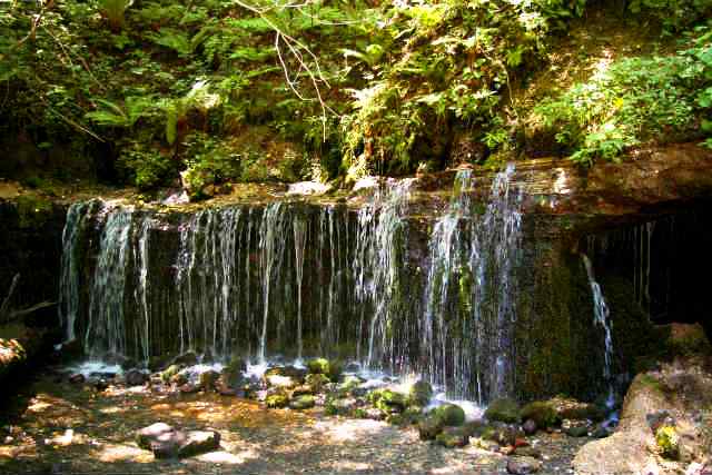 ![]() 本家の白糸の滝よりは、かなりちんけですが水量は多く、澄んだ水辺はとても涼しいです。 伏流水 が岩壁の割れ目から流れ落ちる |