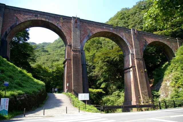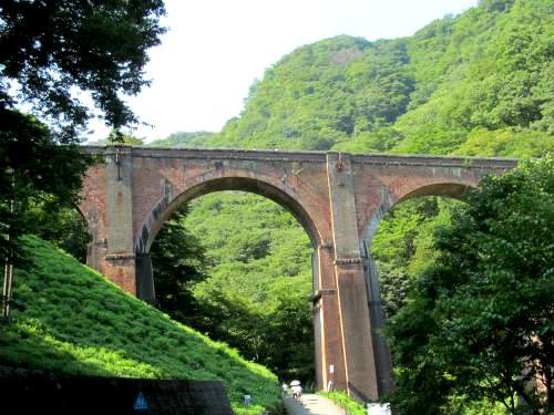 ![]() 『碓氷第三橋梁(めがね橋)』 煉瓦アーチ橋で径間数4、長さ91m、高さ31mでわが国最大の煉瓦づくりアーチ橋。 |
