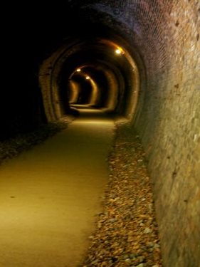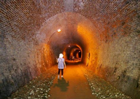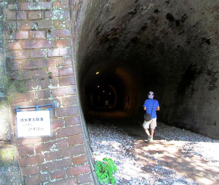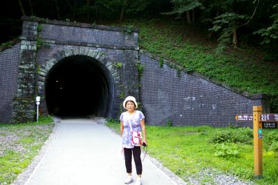![]() めがね橋の両側のトンネルを散策。トンネルの中は寒いぐらいの風が吹き抜けてくる。 どうして冷たい風が吹くのか?碓氷峠(うすいとうげ)の中央に氷があるからです。分かるかなー? |