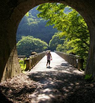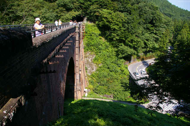 ![]() 明治25年に完成し、昭和38年新線開通に伴い廃線。平成5年に国の重要文化財に指定された。 平成13年廃線敷を利用した遊歩道「アプトの道」として整備され、橋上を歩くことができました。 |