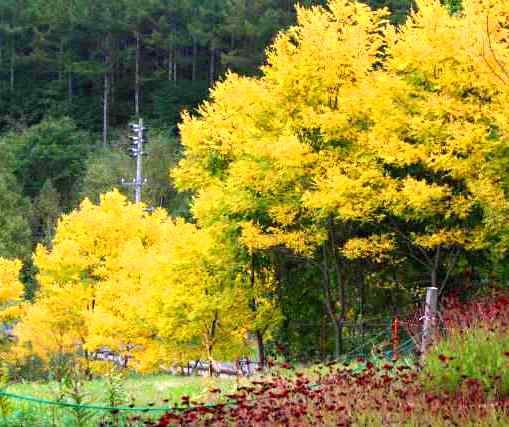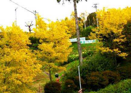![]() ちょっと高い入園料を払えば「リフトは無料です」と言われたが、不思議な気分? 鮮やかに黄葉したアカシアに迎えられて山頂へ・・・ |