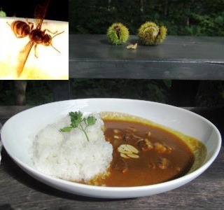![]() 頭の上からは栗が落ちてきました。 自然ではあるが、食事中には蜂がまとわりついてうっとおしかったです!。 |