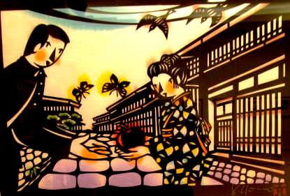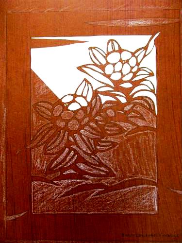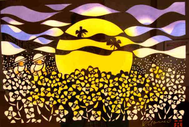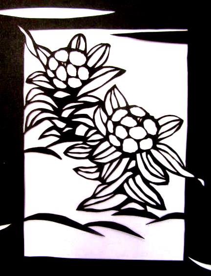 ![]() 初級教材¥2000を買、早速2時間かけて切ってみました(切る所を白く塗りつぶす) 教材なのでデザイン通りに切るだけです。伊勢の渋紙側(裏向き)で切り上げたところ。 |