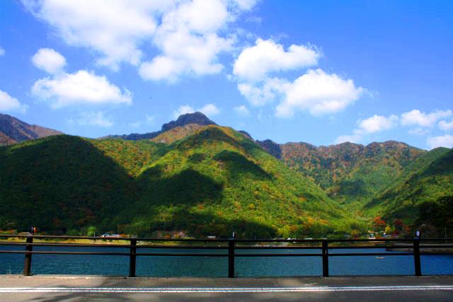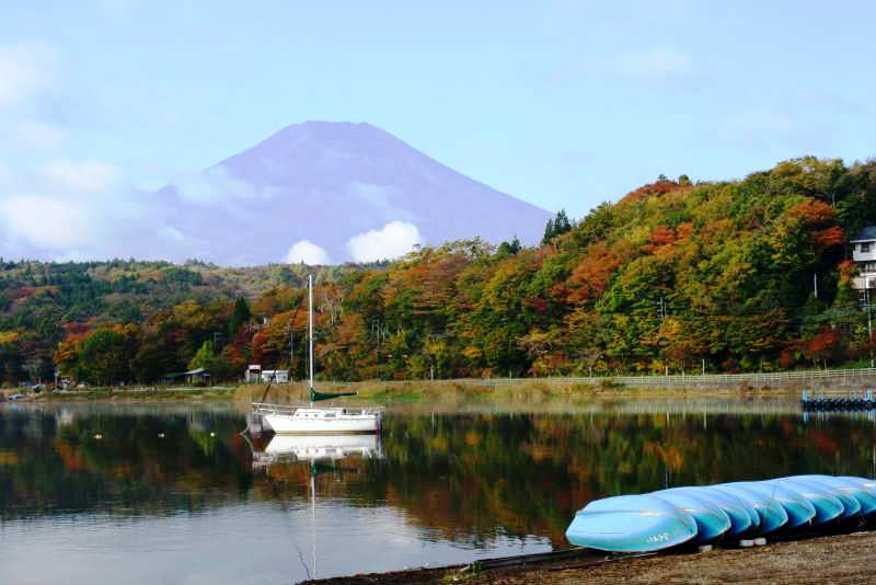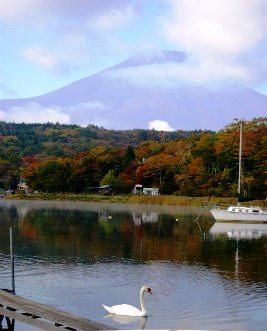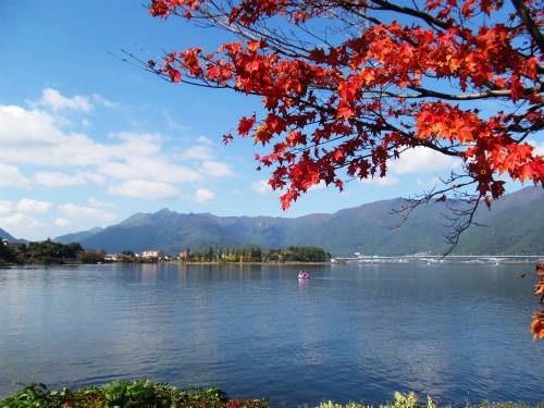 ![]() 西湖からの山並みは程よい紅葉が見られる |