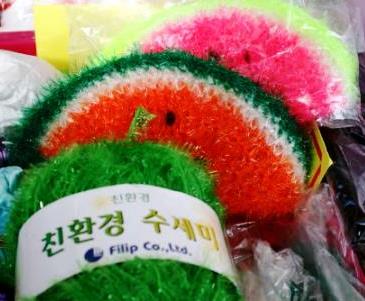 ![]() 韓国の毛糸で作った「エコたわし」 ハングルで右の3文字はスセミ(へちま・たわし)と読める? |