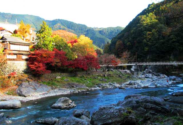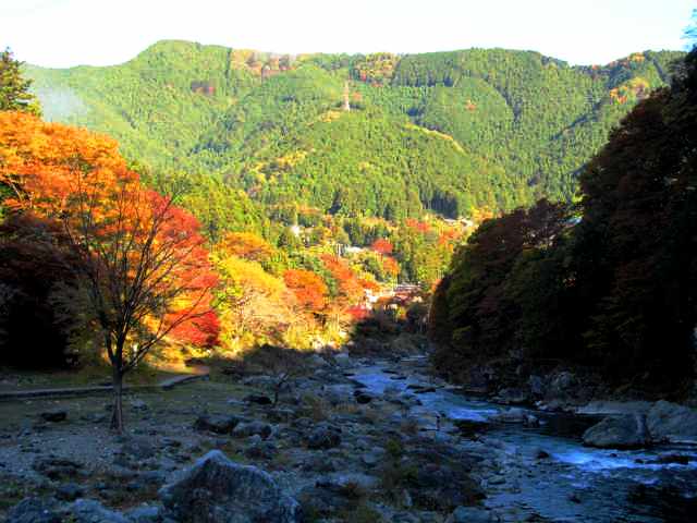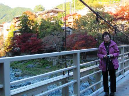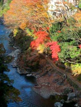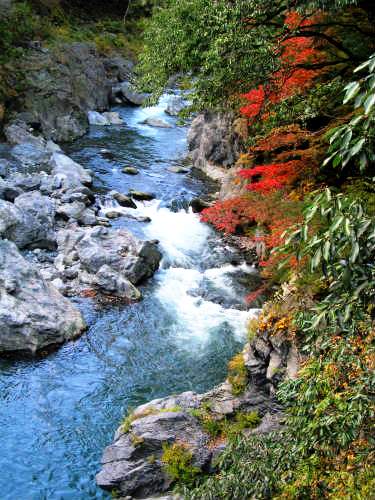 ![]() 楓橋を眺め、巨岩を縫うように白波をたてる多摩川の流れに紅葉がきれいです。 |