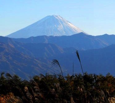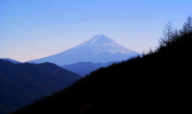 ![]() 少し霞んだ富士山を柳沢峠より望む ブナ、ミズナラなどの 広葉樹を主体とする天然林の山が連なる |