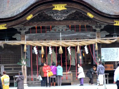 ![]() 駐車場に戻り、次は小国神社へ向かいます。 クラブツーリズムのバスが団体さんを下していました。 |