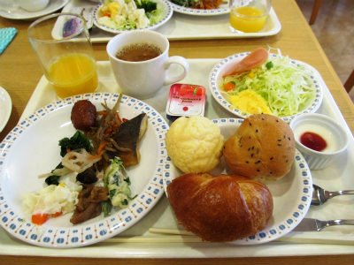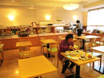![]() 1人1泊朝食付¥3450:朝食のメニューは豊富で味も最高でした(この後和食を頂く) |