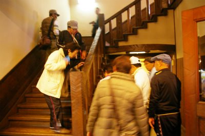 ![]() 手掘り階段(マサカリの小さいので削った)の不思議を聞いているところ |