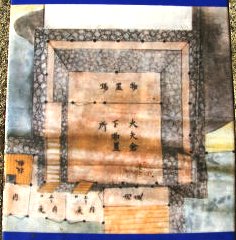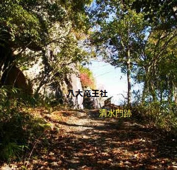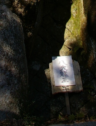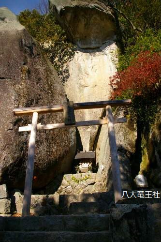 『八大竜王社』 巨石に囲まれた祠 城の白壁を削り赤壁に変える龍を鎮めるために、城の東に竜神様を祀り竜神を鎮めた祠。 |
