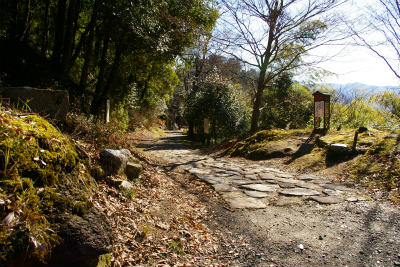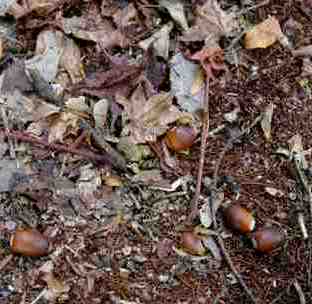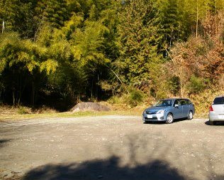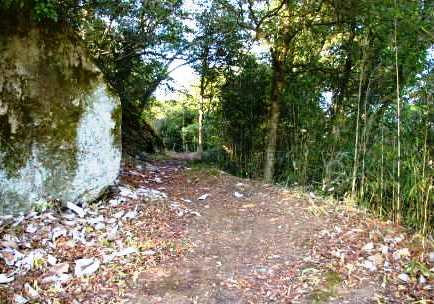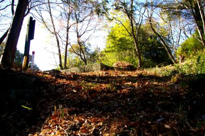 ![]() 竹藪に囲まれた小道のドングリをふみながら進むと・・・ |
