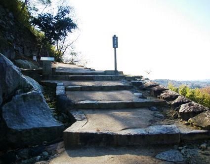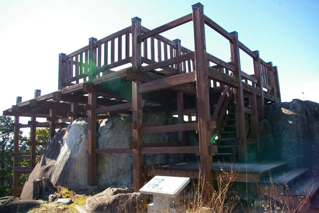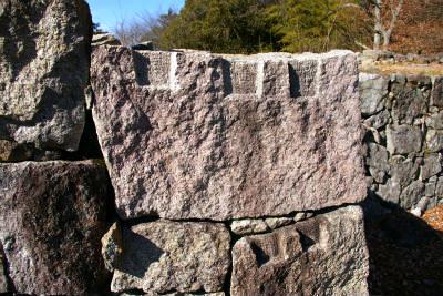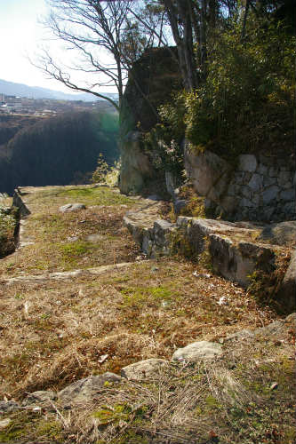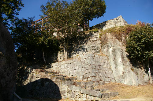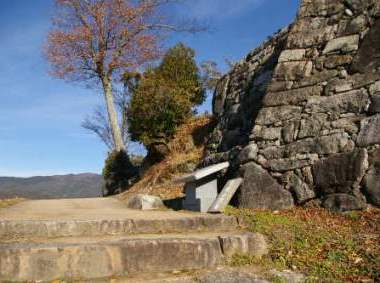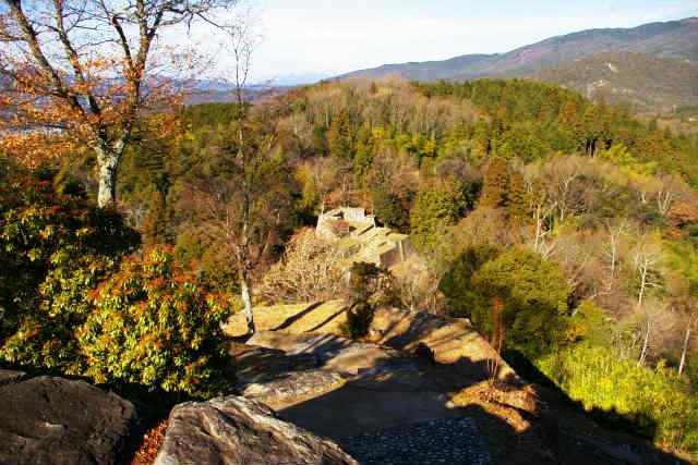 ![]() 『天守址』 今は展望台になっていますが、実際の岩に切り込みがある柱の穴に建てられていました。 天然の巨岩を上手く利用した奇抜な石垣が見事で、石組の技術の素晴らしさが分かります。 |