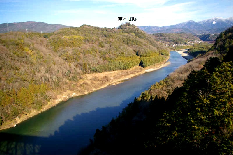 ![]() 中津川市R257の城山大橋より撮影 苗木城は木曽川を天然のお堀に見立てた、城山の絶壁の上に建つお城であった。 |