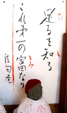 ![]() A【大黒天】 大黒さまの頭につけた頭巾は「上を見ない」という謙虚さを。 また二つの米俵は「二表で満足をする」という、欲を張らない清廉な心を示しているといいます。 念頭に掲げた今年の言葉に遭遇した一言『吾唯足知』(われ、ただ足るを 知る)に感激! |