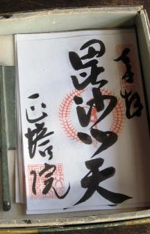 ![]() ![]() 毘沙門天(勇気の神)多聞天とも呼ばれ、四天王の一つ。身に七宝荘厳の甲冑を着て、北方を守護し財宝を護る。 当寺の朱印も箱に入ったセルフサービスでした。しかし何処に毘沙門天が祭ってあったのかなー! |