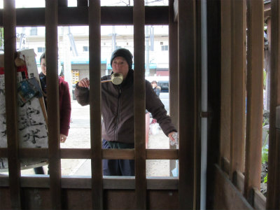 ![]() 湧水の井戸から汲み上げている「清水」を飲む |