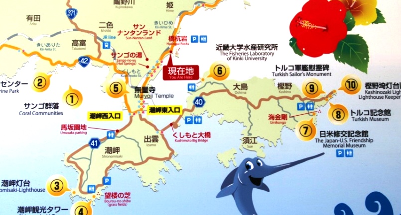 ホテル>R42>橋杭岩>樫野崎灯台>潮岬>白崎海岸>R42>南紀田辺IC>阪和道>
