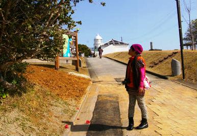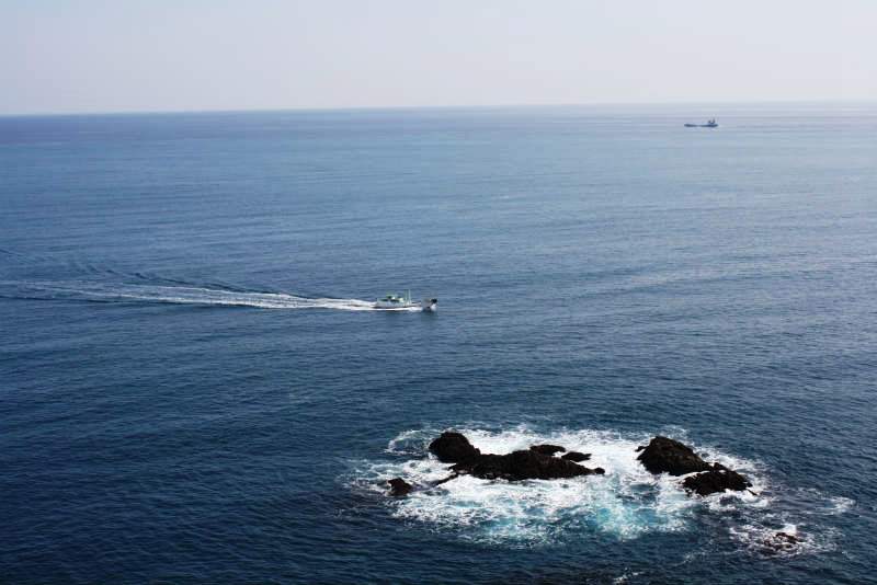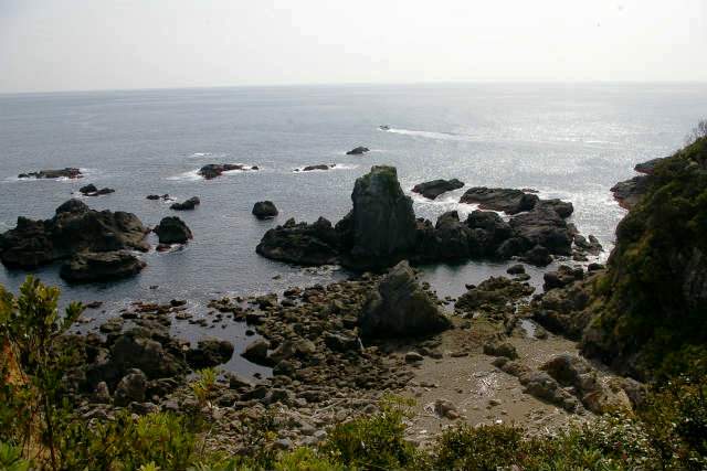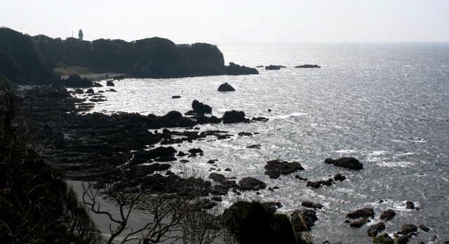 ![]() 灯台の展望台から太平洋を眺める(手前の岩場では魚釣りをしています) |