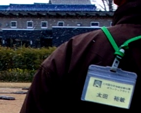 ![]() 雪が降りしきる中の案内中!突風で名札が背中に回って来た! 高床式の物置跡から板造りの敷地境界塀 |