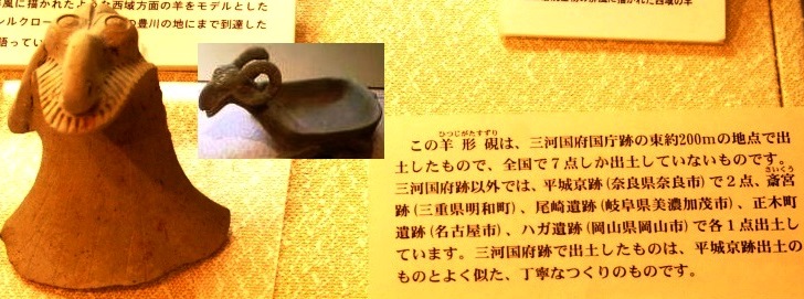 『羊型の硯』 全国で7点出土。この硯は平城京で出土した2点と良く似ている。 西域方面の羊をモデルとしたもので、シルクロードの文化が豊川の地まで到達したことを物語っています。 |