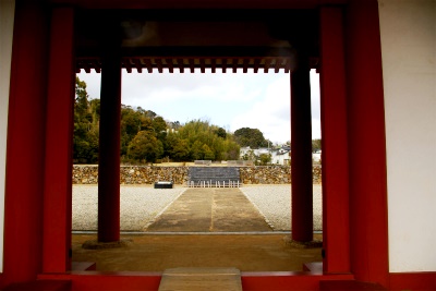 ![]() 金堂基壇から北門を見る |