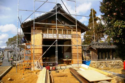 ![]() 上の写真と比べると分かる、現在の国分寺跡。 右端の建物が移築新築中のお寺 |
