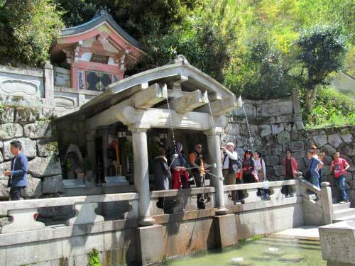 ![]() 本堂の下、音羽山の山腹から滾々とわき出ている清水が、清水寺の由来となった「音羽の滝」です。 |