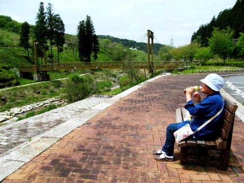 ![]() 稲武から岩村に向かうR257の上矢作『ラフォーレ福寿の里』 ベンチでのんびりランチ(稲武で買ったパンと五目御飯)です |