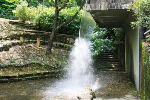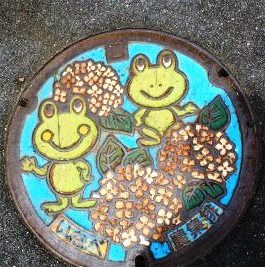 ![]() 水のカーテンをくぐる 足元には個性豊かなマンホールのふた |