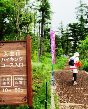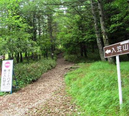 ![]() R20を15分程走ると『入笠山』の案内板があり右折、山には雲がかかり天気が心配だ。 |
