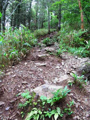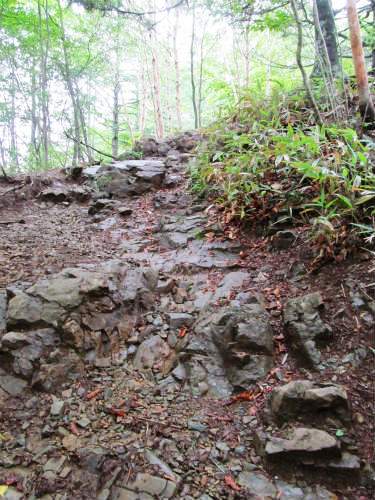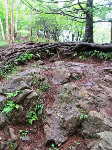 ![]() かなり急勾配の岩と木の根のコースに驚いた |