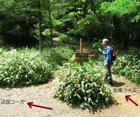 ![]() 7〜8分もしたら「岩場コース」と「迂回コース」の分岐点に、私は岩場から登り迂回コースで帰る計画。 |